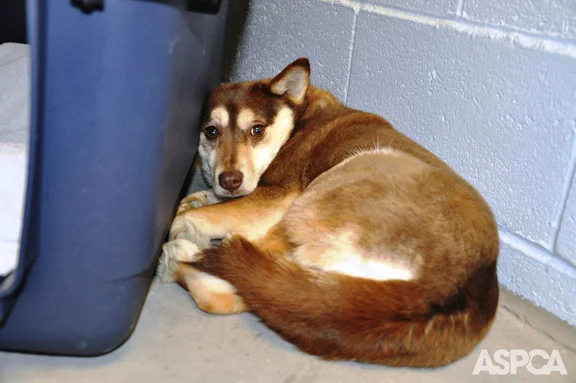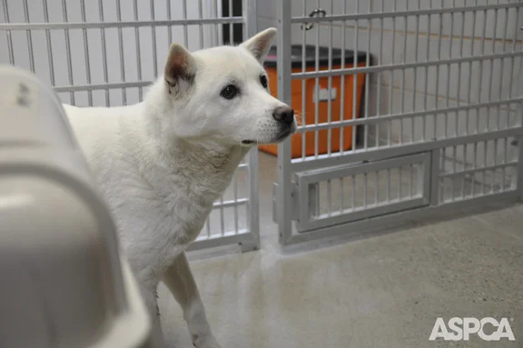 At the request of Humane Society International (HSI), two of the 23 dogs rescued from a meat farm in South Korea were transported to St. Hubert’s Animal Welfare Center and transferred over to the ASPCA Behavioral Rehabilitation Center at St. Hubert's on February 23. HSI officials contacted St. Hubert’s and the ASPCA after it became apparent that the two dogs—a white Jindo named Robin, and Kaya, a Husky mix—required specialized behavioral rehabilitation.