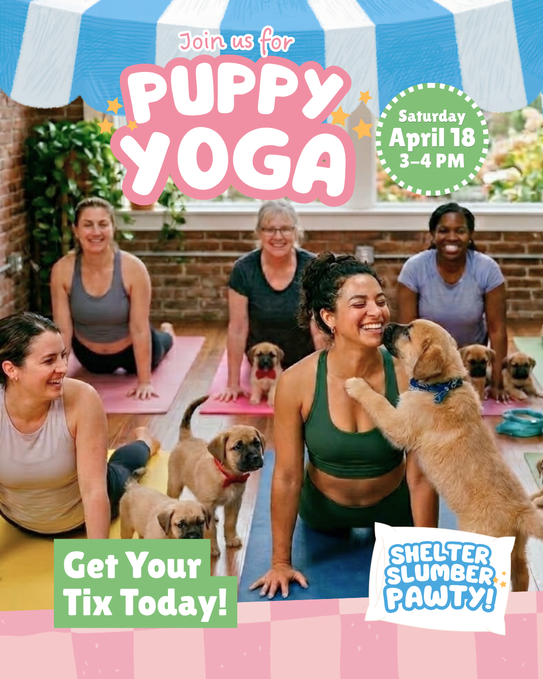 Act fast! Grab you ticket to our exclusive Slumber Fest Puppy Yoga event before it sells out.