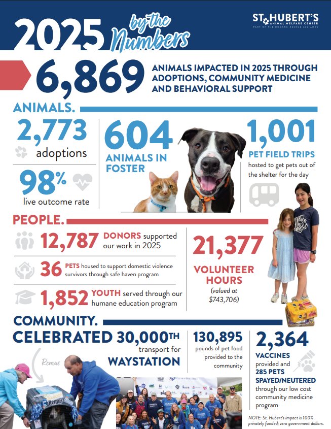 These are just a few examples of the incredible progress made in 2025 to solidify St. Hubert’s position as a community-centered organization dedicated to preserving the human-animal bond and creating a more compassionate community for animals in New Jersey.